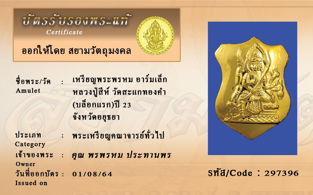 รหัสสินค้า : 297396 เหรียญพระพรหม อาร์มเล็ก หลวงปู่สีห์ วัดสะแกทองคำ (บล็อกแรก)ปี 23 จังหวัดอยุธยา
