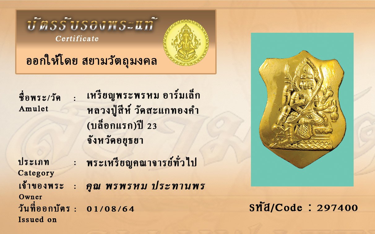 รหัสสินค้า : 297400 เหรียญพระพรหม อาร์มเล็ก หลวงปู่สีห์ วัดสะแกทองคำ (บล็อกแรก)ปี 23 จังหวัดอยุธยา