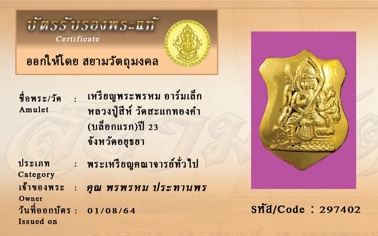 รหัสสินค้า : 297402 เหรียญพระพรหม อาร์มเล็ก หลวงปู่สีห์ วัดสะแกทองคำ (บล็อกแรก)ปี 23 จังหวัดอยุธยา
