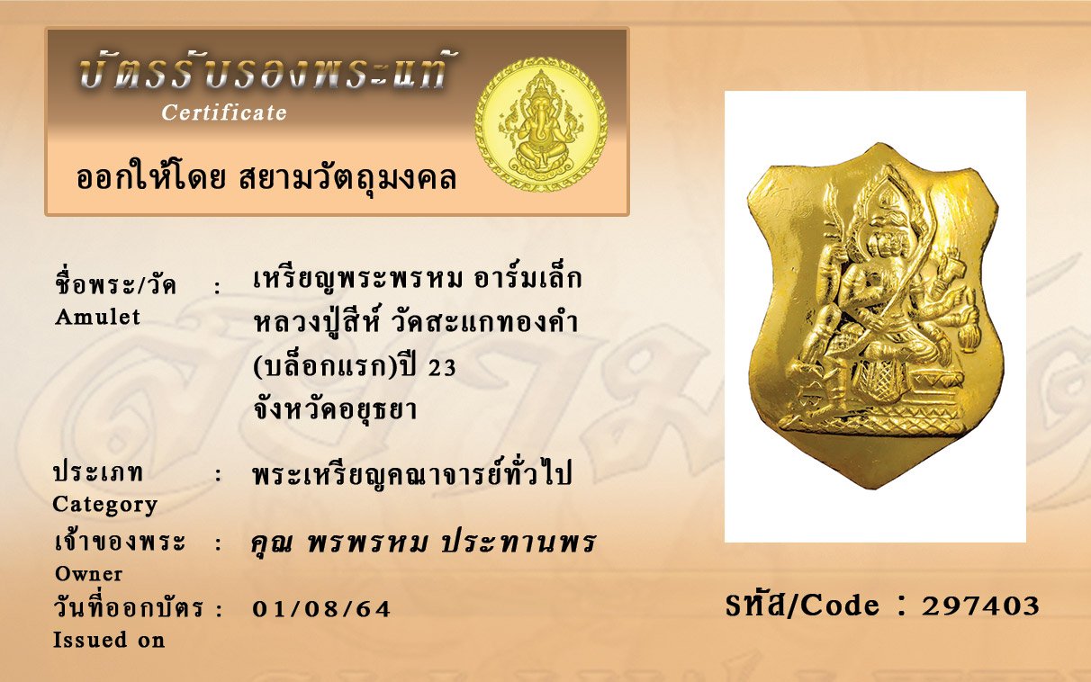 รหัสสินค้า : 297403 เหรียญพระพรหม อาร์มเล็ก หลวงปู่สีห์ วัดสะแกทองคำ (บล็อกแรก)ปี 23 จังหวัดอยุธยา