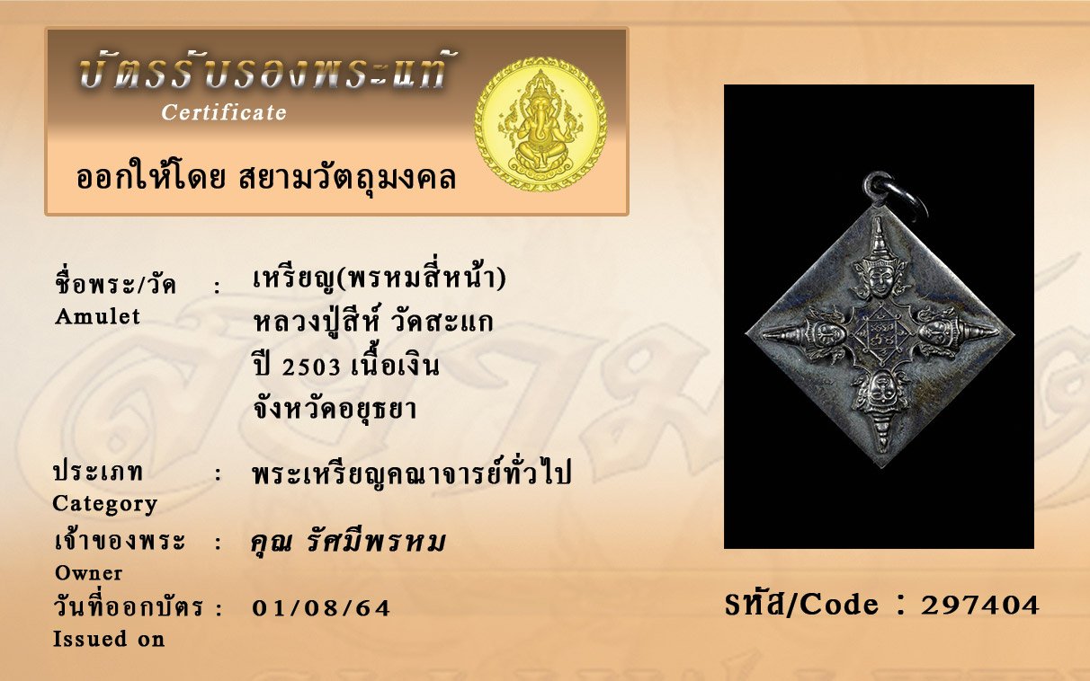 รหัสสินค้า : 297404 เหรียญ(พรหมสี่หน้า) หลวงปู่สีห์ วัดสะแก ปี 2503 เนื้อเงิน จังหวัดอยุธยา