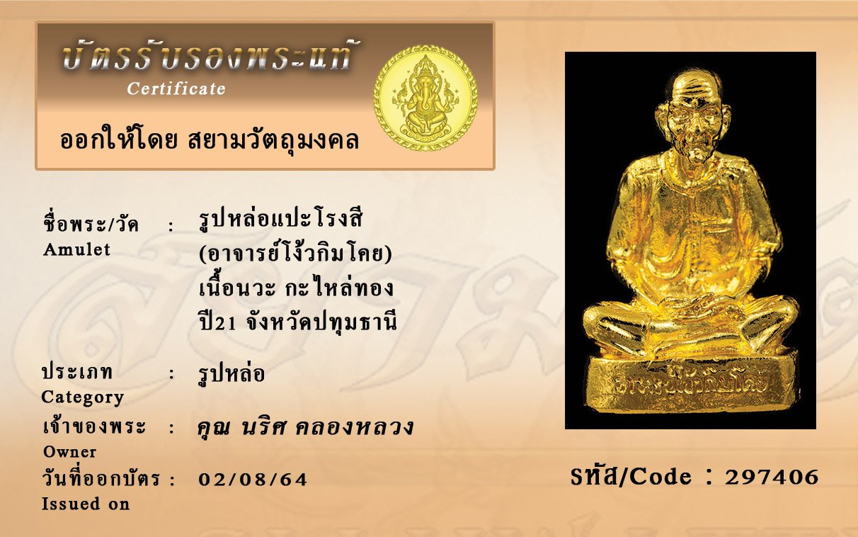 รหัสสินค้า : 279406 รูปหล่อแปะโรงสี (อาจารย์โง้วกิมโคย) เนื้อนวะ กะไหล่ทอง ปี2521 จังหวัดปทุมธานี