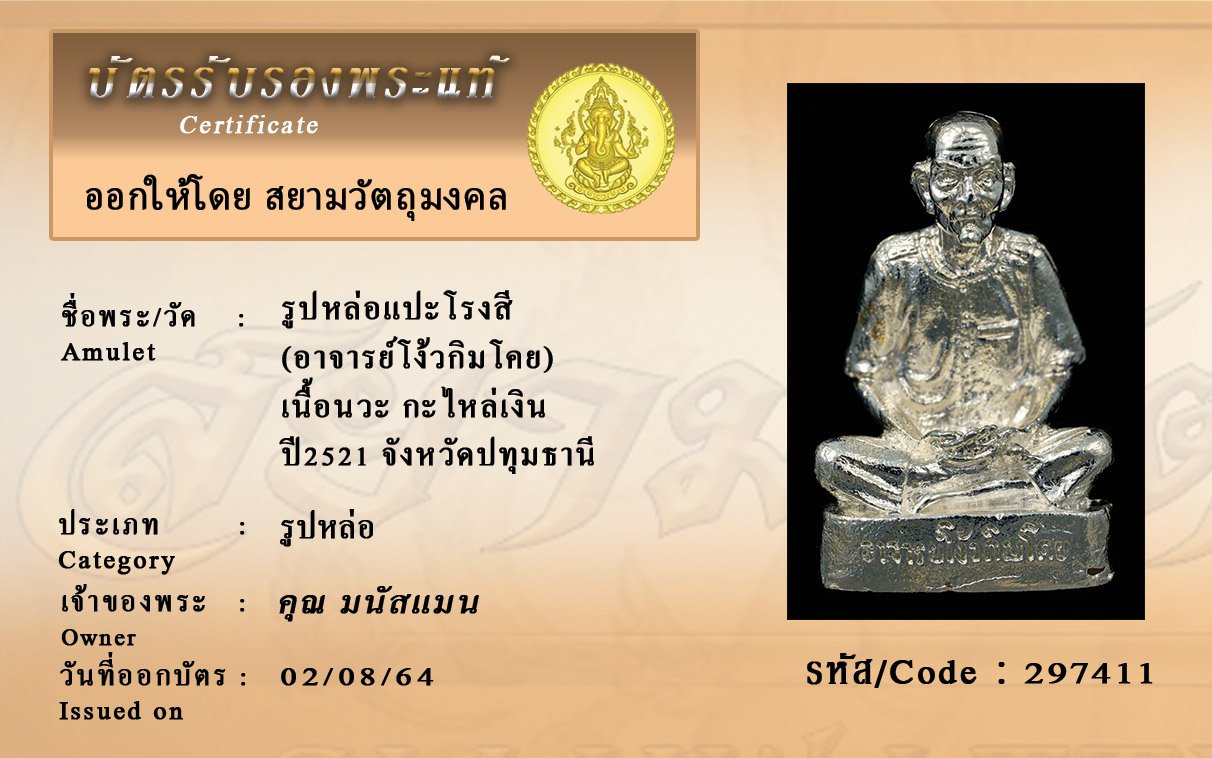 รหัสสินค้า : 279411 รูปหล่อแปะโรงสี (อาจารย์โง้วกิมโคย) เนื้อนวะ กะไหล่เงิน ปี2521 จังหวัดปทุมธานี