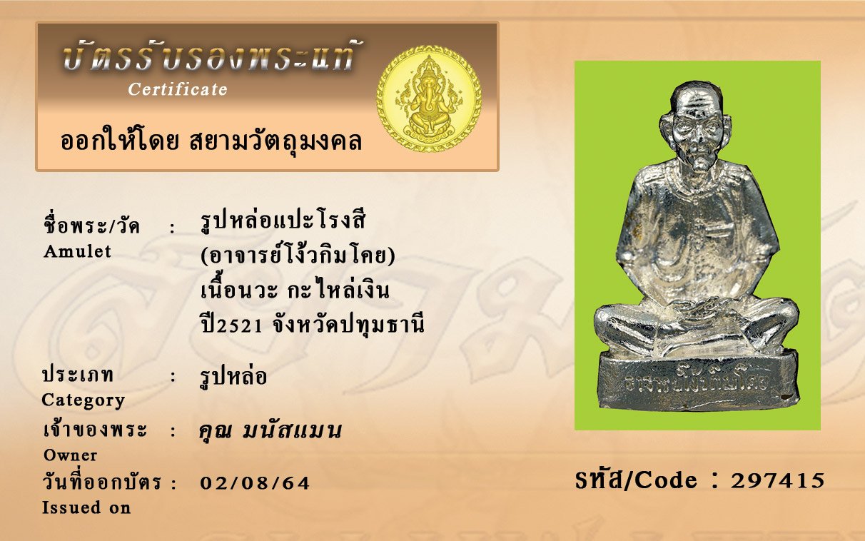 รหัสสินค้า : 279415 รูปหล่อแปะโรงสี (อาจารย์โง้วกิมโคย) เนื้อนวะ กะไหล่เงิน ปี2521 จังหวัดปทุมธานี