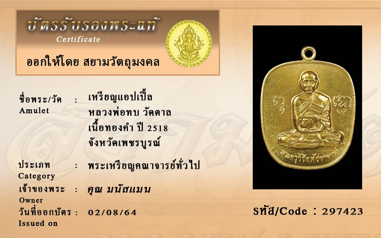 รหัสสินค้า : 279423 เหรียญแอปเปิ้ล หลวงพ่อทบ วัดตาล เนื้อทองคำ ปี 2518 จังหวัดเพชรบูรณ์