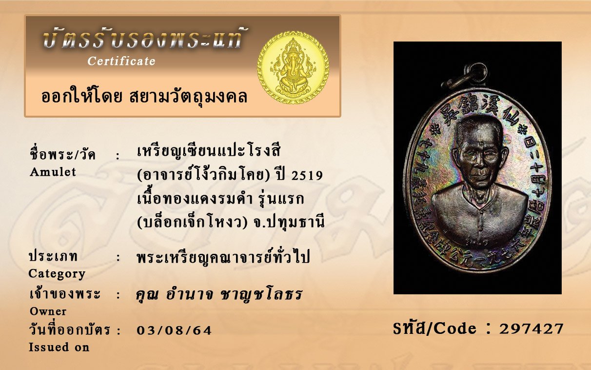 รหัสสินค้า : 297427 เหรียญเซียนแปะโรงสี (อาจารย์โง้วกิมโคย) ปี 2519 เนื้อทองแดงรมดำ รุ่นแรก (บล็อกเจ็กโหงว) จ.ปทุมธานี