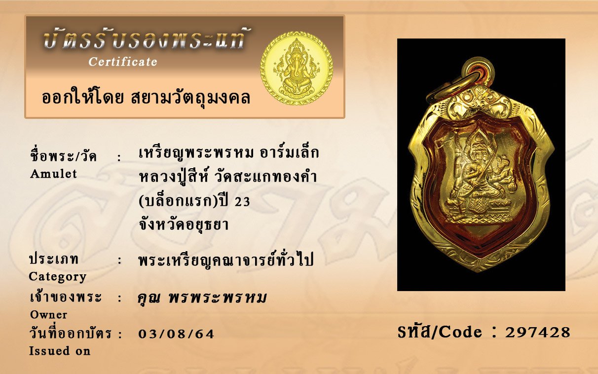 รหัสสินค้า : 297428 เหรียญพระพรหม อาร์มเล็ก หลวงปู่สีห์ วัดสะแกทองคำ (บล็อกแรก)ปี 23 จังหวัดอยุธยา
