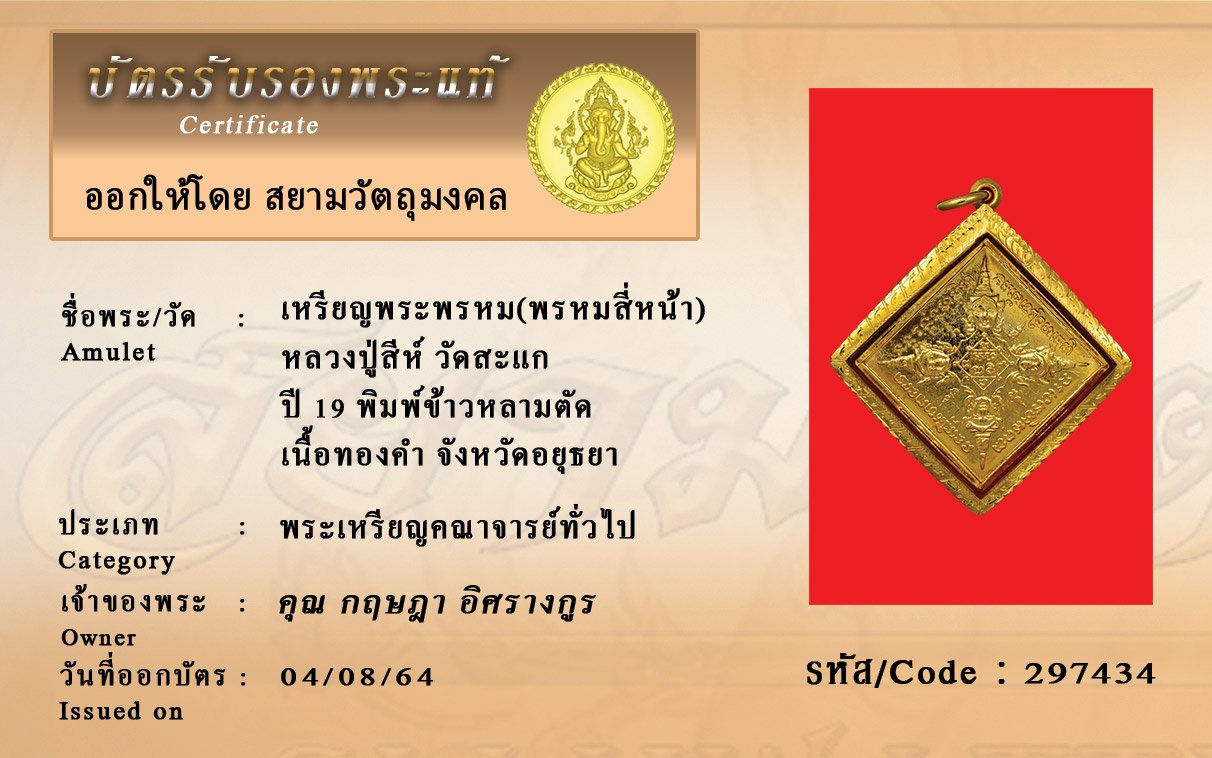 รหัสสินค้า : 297434 เหรียญพระพรหม(พรหมสี่หน้า) หลวงปู่สีห์ วัดสะแก ปี 19 พิมพ์ข้าวหลามตัด เนื้อทองคำ จังหวัดอยุธยา