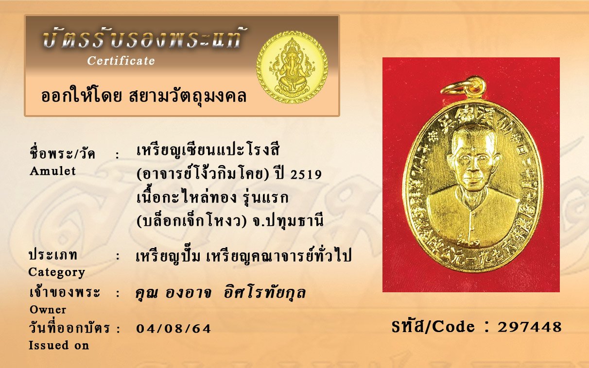 รหัสสินค้า : 297448 เหรียญเซียนแปะโรงสี (อาจารย์โง้วกิมโคย) ปี 2519 เนื้อกะไหล่ทอง รุ่นแรก (บล็อกเจ็กโหงว) จ.ปทุมธานี