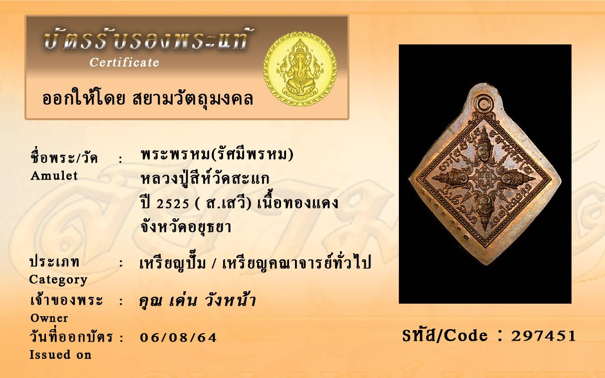 รหัสสินค้า : 297451 พระพรหม(รัศมีพรหม) หลวงปู่สีห์วัดสะแก ปี 2525 ( ส.เสวี) เนื้อทองแดง จังหวัดอยุธยา