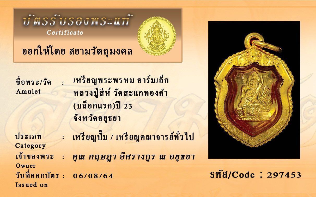 รหัสสินค้า : 297453 เหรียญพระพรหม อาร์มเล็ก หลวงปู่สีห์ วัดสะแกทองคำ (บล็อกแรก)ปี 23 จังหวัดอยุธยา