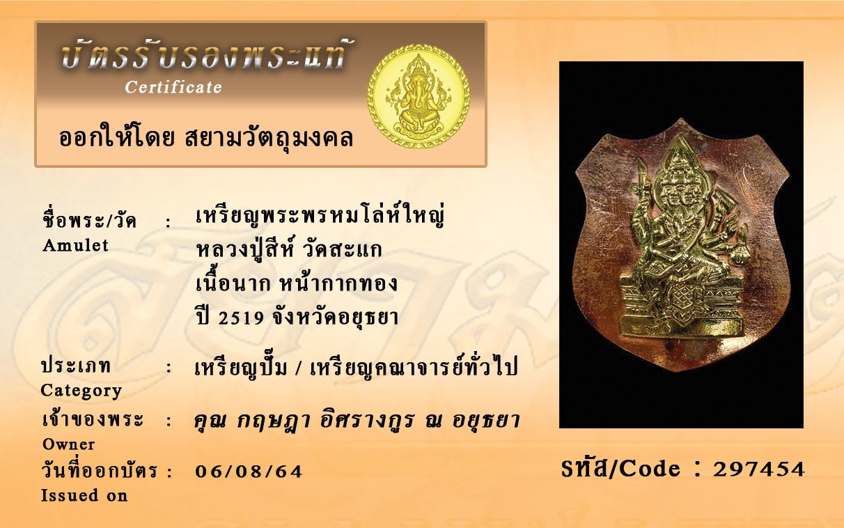 รหัสสินค้า : 297454 เหรียญพระพรหมโล่ห์ใหญ่ หลวงปู่สีห์ วัดสะแก เนื้อนาก หน้ากากทอง ปี 2519 จังหวัดอยุธยา