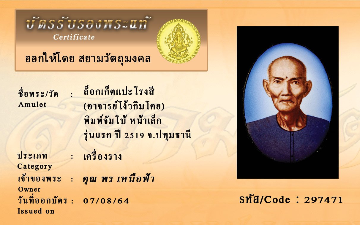 รหัสสินค้า : 297471 ล็อกเก็ตแปะโรงสี (อาจารย์โง้วกิมโคย) พิมพ์จัมโบ้ หน้าเล็ก รุ่นแรก ปี 2519 จ.ปทุมธานี