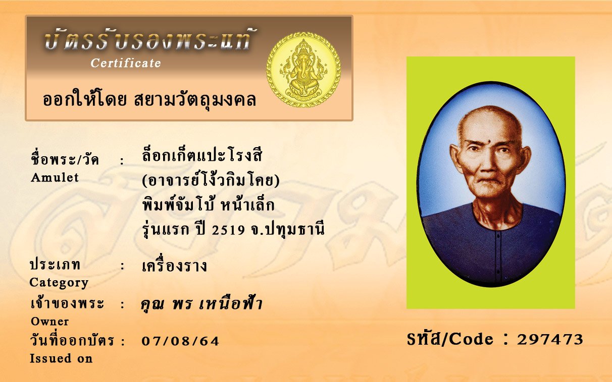 รหัสสินค้า : 297473 ล็อกเก็ตแปะโรงสี (อาจารย์โง้วกิมโคย) พิมพ์จัมโบ้ หน้าเล็ก รุ่นแรก ปี 2519 จ.ปทุมธานี