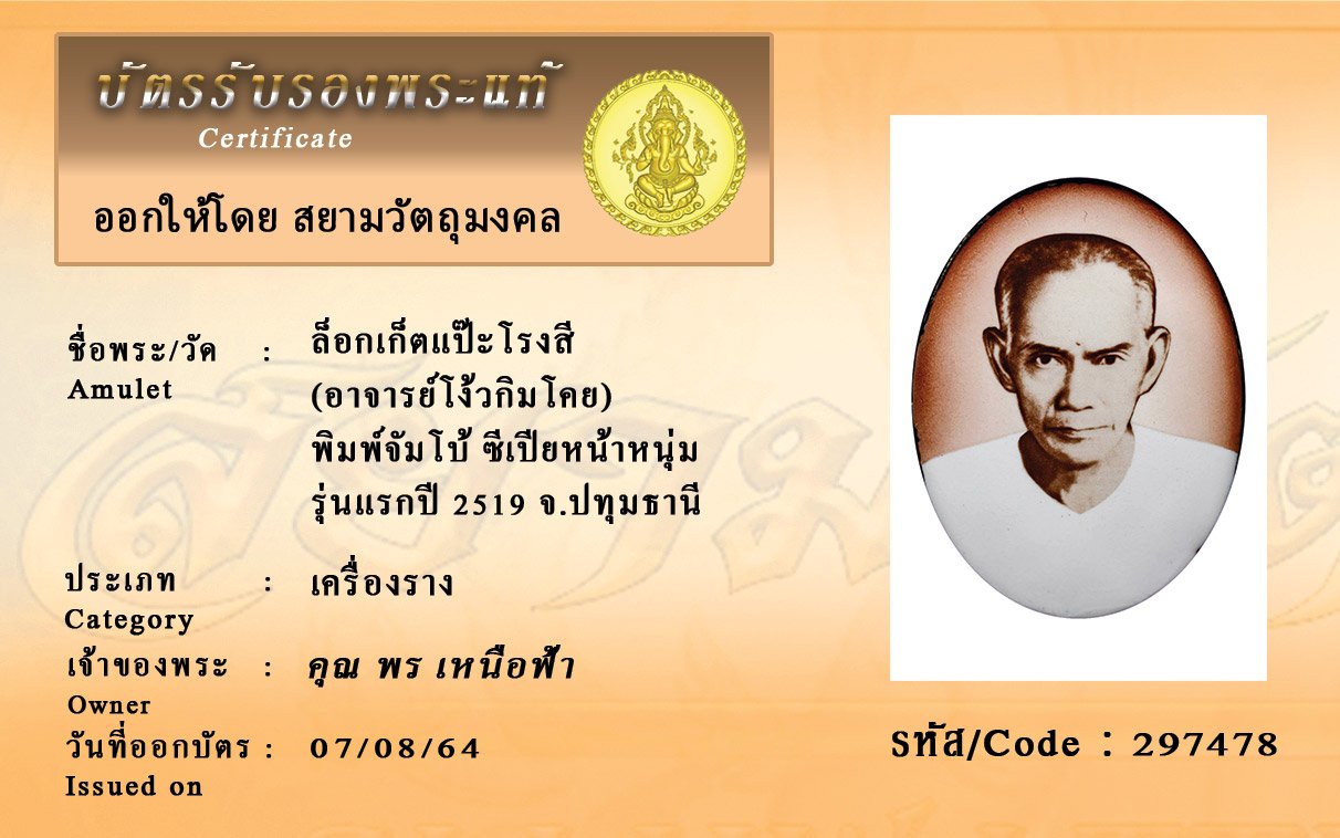 รหัสสินค้า : 297478 ล็อกเก็ตแป๊ะโรงสี (อาจารย์โง้วกิมโคย) พิมพ์จัมโบ้ ซีเปียหน้าหนุ่ม รุ่นแรกปี 2519 จ.ปทุมธานี