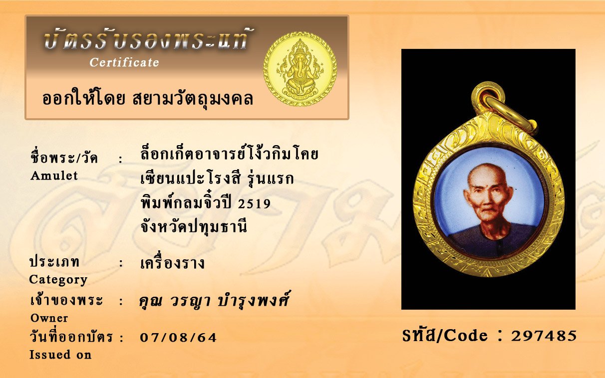 รหัสสินค้า : 297485 ล็อกเก็ตอาจารย์โง้วกิมโคย เซียนแปะโรงสี รุ่นแรก พิมพ์กลมจิ๋วปี 2519 จังหวัดปทุมธานี