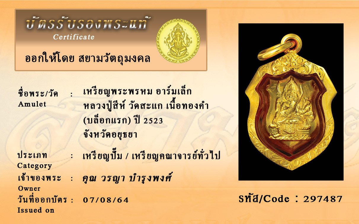 รหัสสินค้า : 297487 เหรียญพระพรหม อาร์มเล็ก หลวงปู่สีห์ วัดสะแก เนื้อทองคำ (บล็อกแรก) ปี 2523 จังหวัดอยุธยา