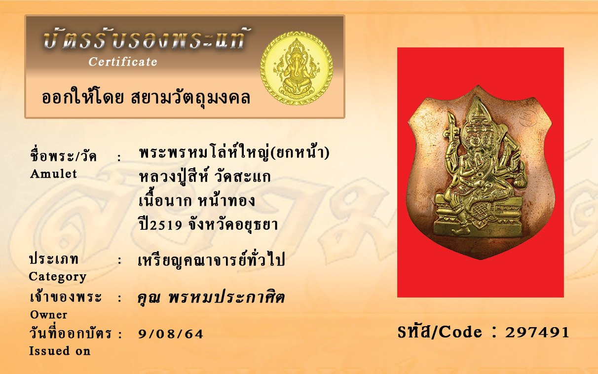รหัสสินค้า : 297491 พระพรหมโล่ห์ใหญ่(ยกหน้า) หลวงปู่สีห์ วัดสะแก เนื้อนาก หน้าทอง ปี2519 จังหวัดอยุธยา