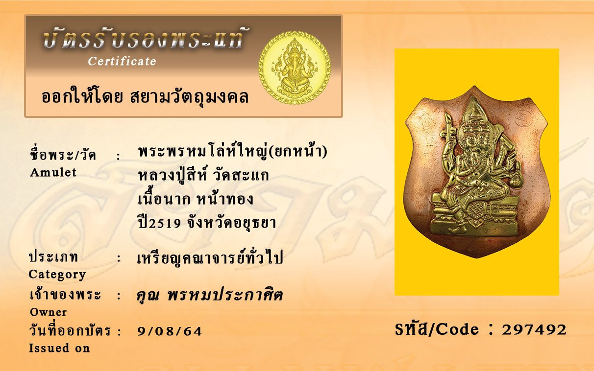 รหัสสินค้า : 297492 พระพรหมโล่ห์ใหญ่(ยกหน้า) หลวงปู่สีห์ วัดสะแก เนื้อนาก หน้าทอง ปี2519 จังหวัดอยุธยา