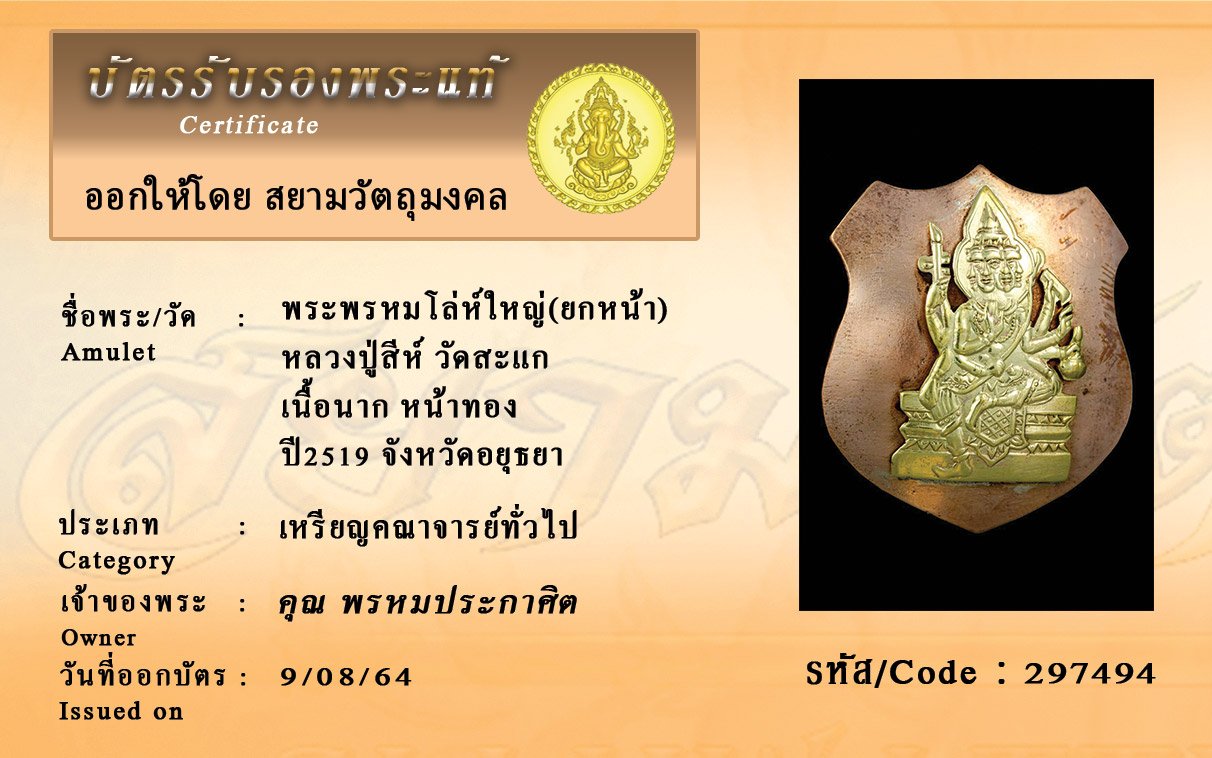 รหัสสินค้า : 297494 พระพรหมโล่ห์ใหญ่(ยกหน้า) หลวงปู่สีห์ วัดสะแก เนื้อนาก หน้าทอง ปี2519 จังหวัดอยุธยา