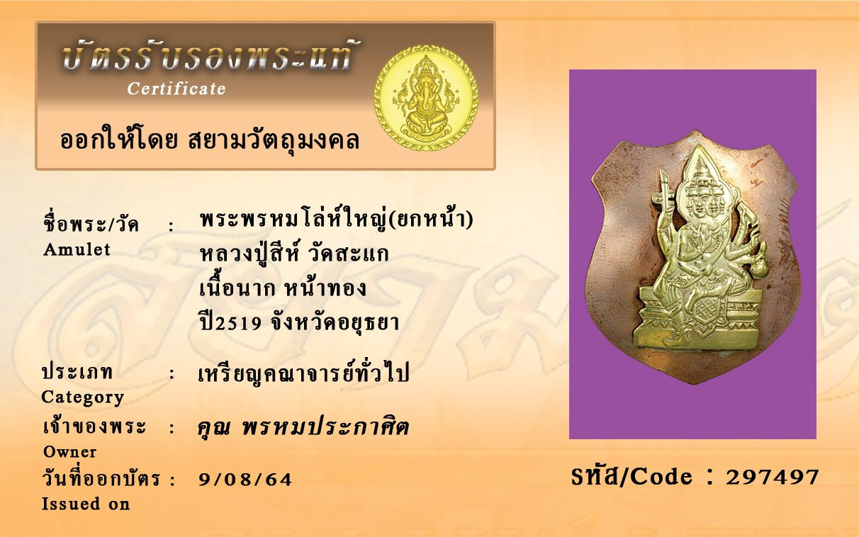 รหัสสินค้า : 297497 พระพรหมโล่ห์ใหญ่(ยกหน้า) หลวงปู่สีห์ วัดสะแก เนื้อนาก หน้าทอง ปี2519 จังหวัดอยุธยา