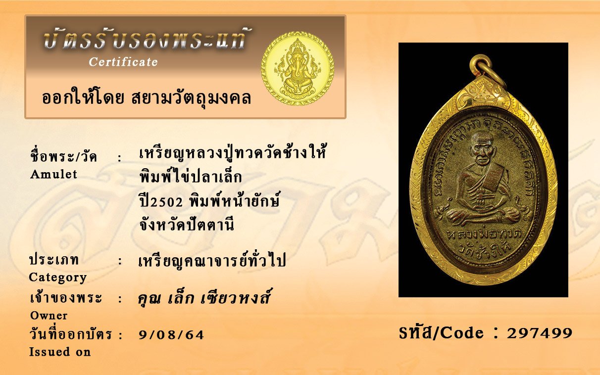 รหัสสินค้า : 297499 เหรียญหลวงปู่ทวดวัดช้างให้ พิมพ์ไข่ปลาเล็ก ปี2502 พิมพ์หน้ายักษ์ จังหวัดปัตตานี