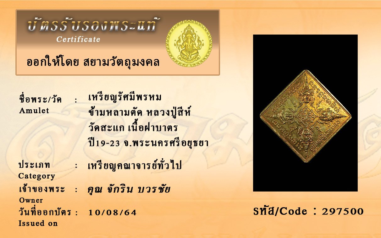 รหัสสินค้า : 297500 เหรียญรัศมีพรหม ข้ามหลามตัด หลวงปู่สีห์ วัดสะแก เนื้อฝาบาตร ปี19-23 จ.พระนครศรีอยุธยา