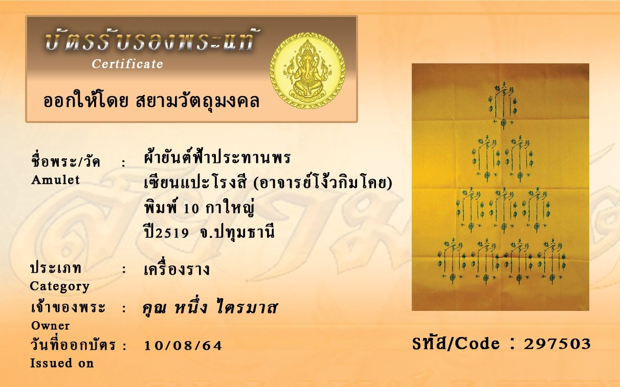 รหัสสินค้า : 297503 ผ้ายันต์ฟ้าประทานพร เซียนแปะโรงสี (อาจารย์โง้วกิมโคย) พิมพ์ 10 กาใหญ่ ปี2519 จ.ปทุมธานี