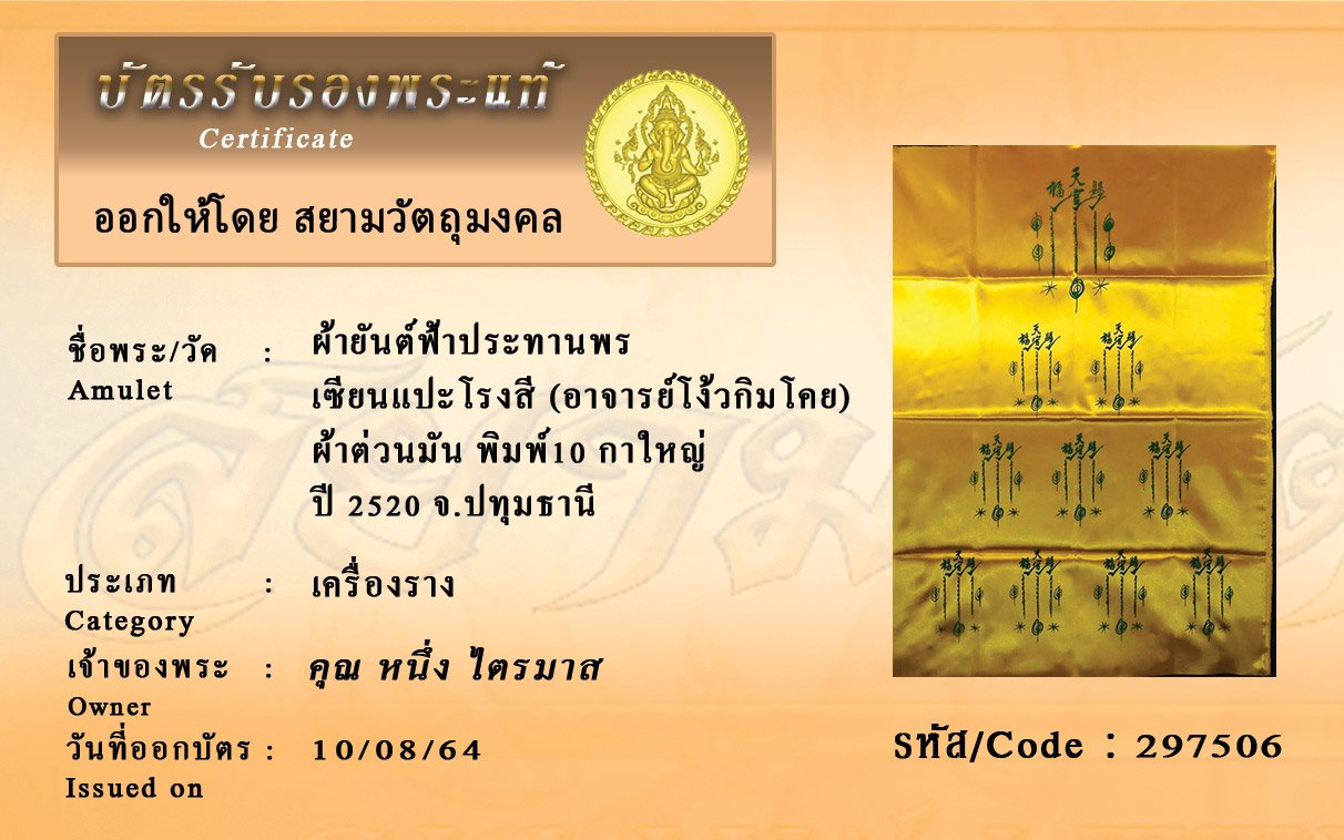 รหัสสินค้า : 297506 ผ้ายันต์ฟ้าประทานพร เซียนแปะโรงสี (อาจารย์โง้วกิมโคย) ผ้าต่วนมัน พิมพ์10 กาใหญ่ ปี 2520 จ.ปทุมธานี