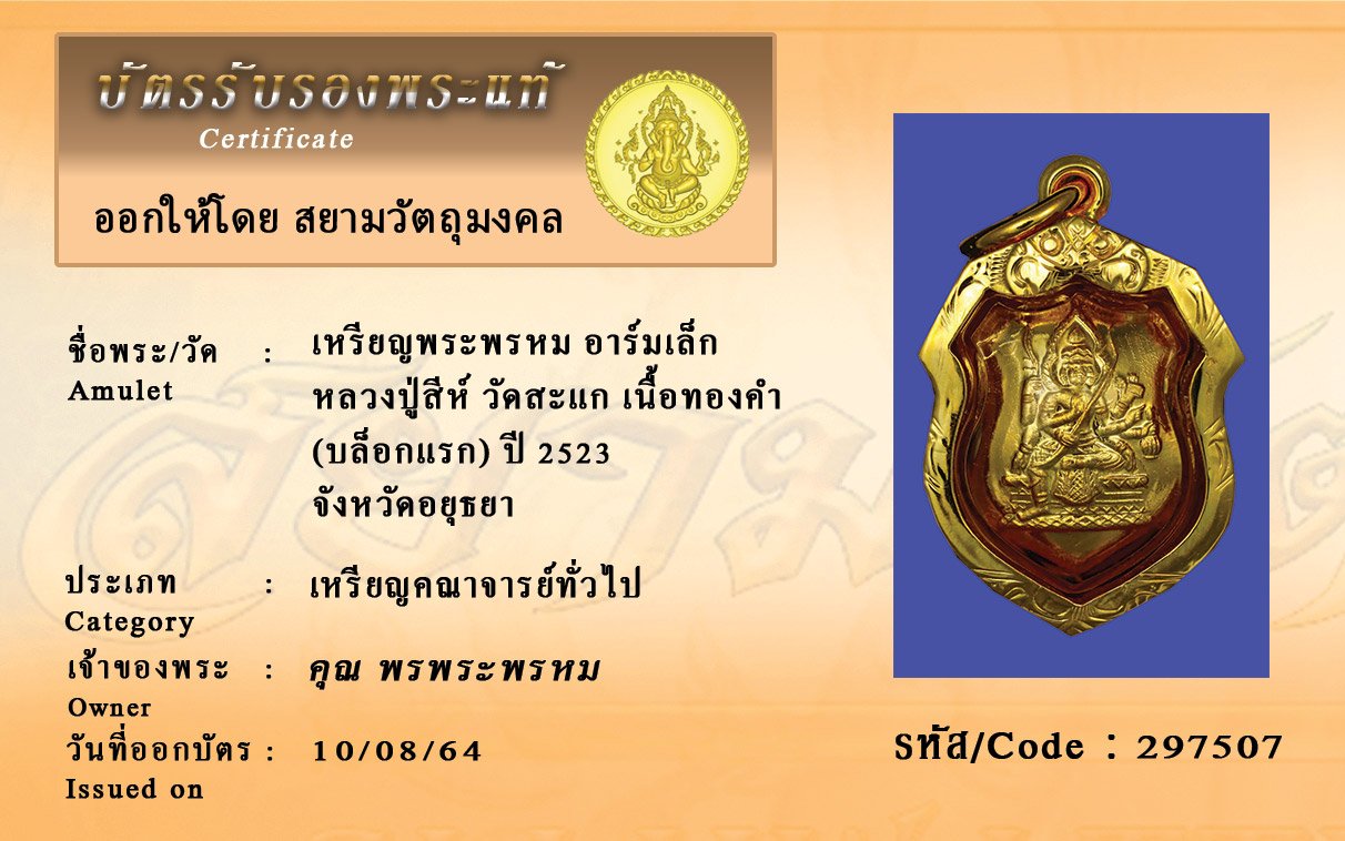 รหัสสินค้า : 297507 เหรียญพระพรหม อาร์มเล็ก หลวงปู่สีห์ วัดสะแก เนื้อทองคำ (บล็อกแรก) ปี 2523 จังหวัดอยุธยา