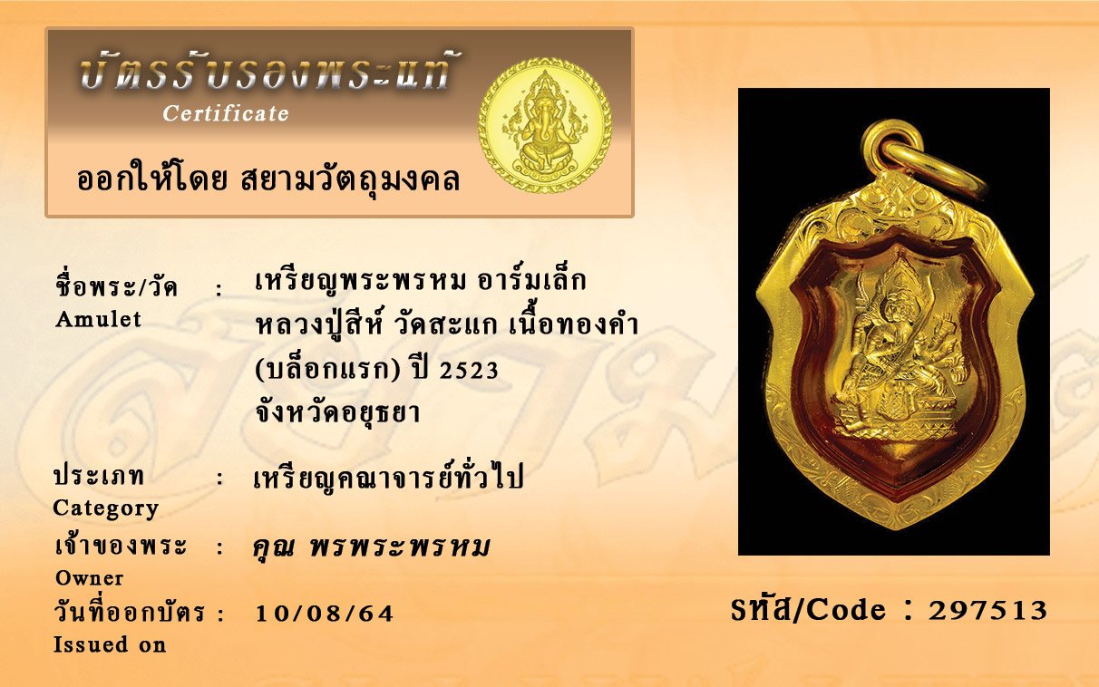 รหัสสินค้า : 297513 เหรียญพระพรหม อาร์มเล็ก หลวงปู่สีห์ วัดสะแก เนื้อทองคำ (บล็อกแรก) ปี 2523 จังหวัดอยุธยา