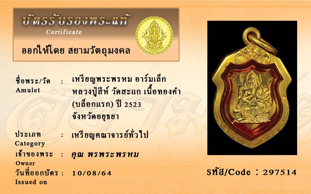 รหัสสินค้า : 297514 เหรียญพระพรหม อาร์มเล็ก หลวงปู่สีห์ วัดสะแก เนื้อทองคำ (บล็อกแรก) ปี 2523 จังหวัดอยุธยา