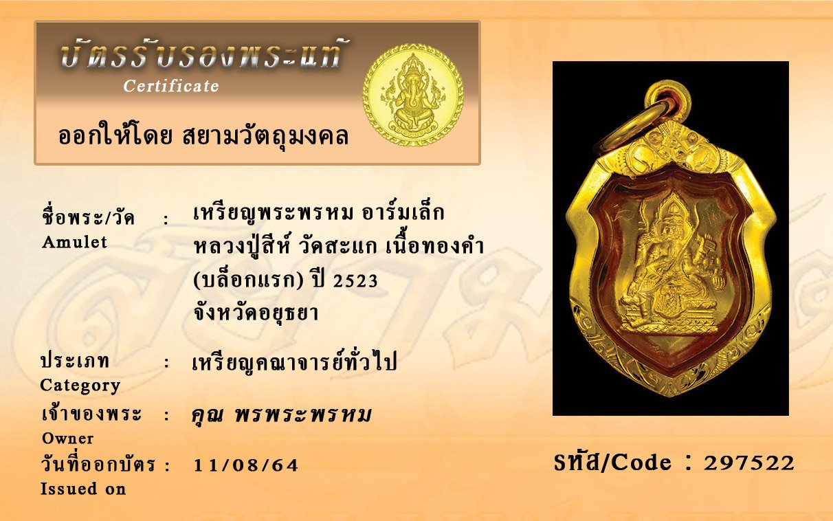 รหัสสินค้า : 297522 เหรียญพระพรหม อาร์มเล็ก หลวงปู่สีห์ วัดสะแก เนื้อทองคำ (บล็อกแรก) ปี 2523 จังหวัดอยุธยา