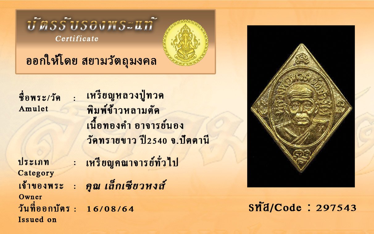 รหัสสินค้า : 297543 เหรียญหลวงปู่ทวด พิมพ์ข้าวหลามตัด เนื้อทองคำ อาจารย์นอง วัดทรายขาว ปี2540 จ.ปัตตานี