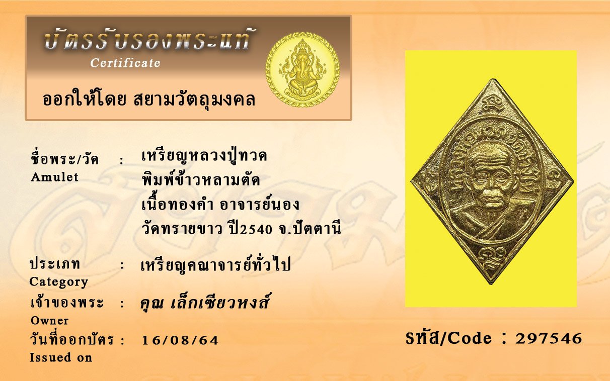 รหัสสินค้า : 297546 เหรียญหลวงปู่ทวด พิมพ์ข้าวหลามตัด เนื้อทองคำ อาจารย์นอง วัดทรายขาว ปี2540 จ.ปัตตานี