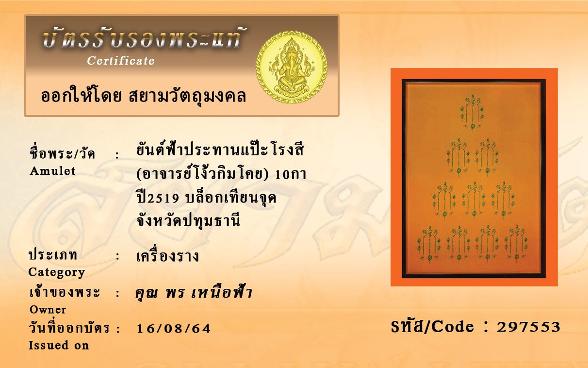 รหัสสินค้า : 297553 ยันต์ฟ้าประทานแป๊ะโรงสี (อาจารย์โง้วกิมโคย) 10กา ปี2519 บล็อกเทียนจุด จังหวัดปทุมธานี