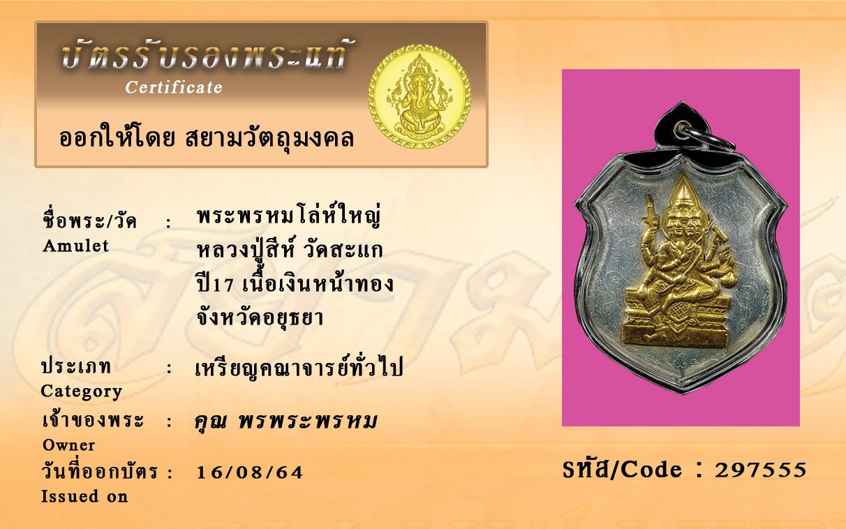 รหัสสินค้า : 297555 พระพรหมโล่ห์ใหญ่ หลวงปู่สีห์ วัดสะแก ปี17 เนื้อเงินหน้าทอง จังหวัดอยุธยา