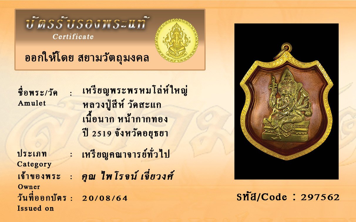 รหัสสินค้า : 297562 เหรียญพระพรหมโล่ห์ใหญ่ หลวงปู่สีห์ วัดสะแก เนื้อนาก หน้ากากทอง ปี 2519 จังหวัดอยุธยา