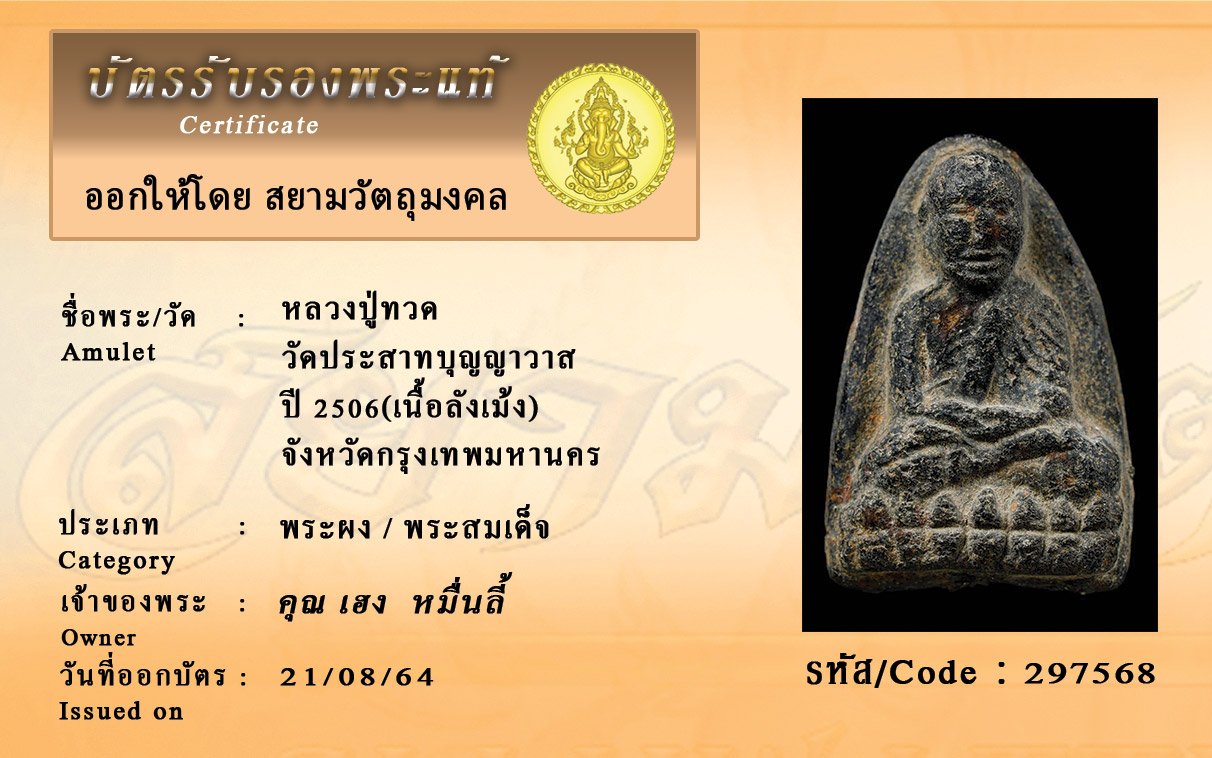 รหัสสินค้า : 297568 หลวงปู่ทวด วัดประสาทบุญญาวาส ปี 2506(เนื้อลังเม้ง) จังหวัดกรุงเทพมหานคร