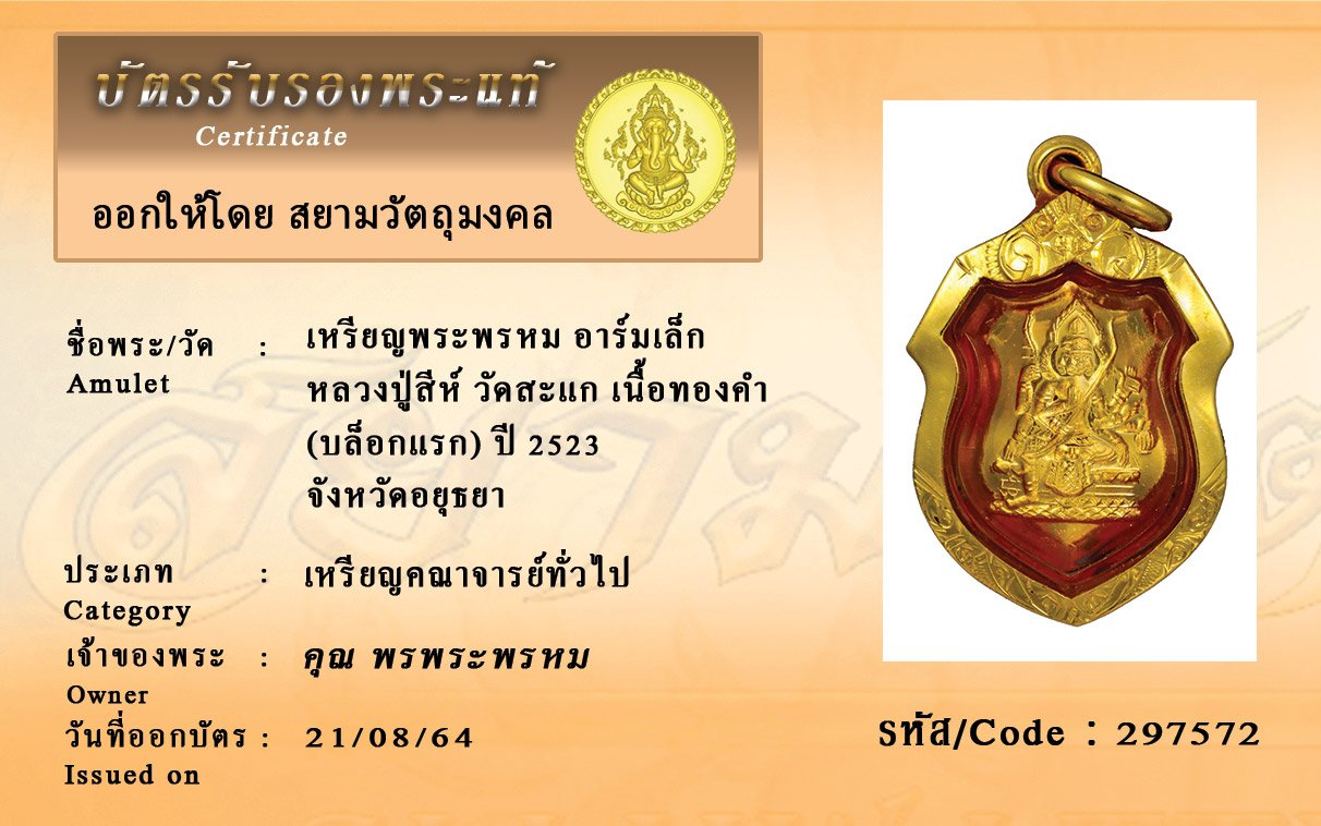 รหัสสินค้า : 297572 เหรียญพระพรหม อาร์มเล็ก หลวงปู่สีห์ วัดสะแก เนื้อทองคำ (บล็อกแรก) ปี 2523 จังหวัดอยุธยา