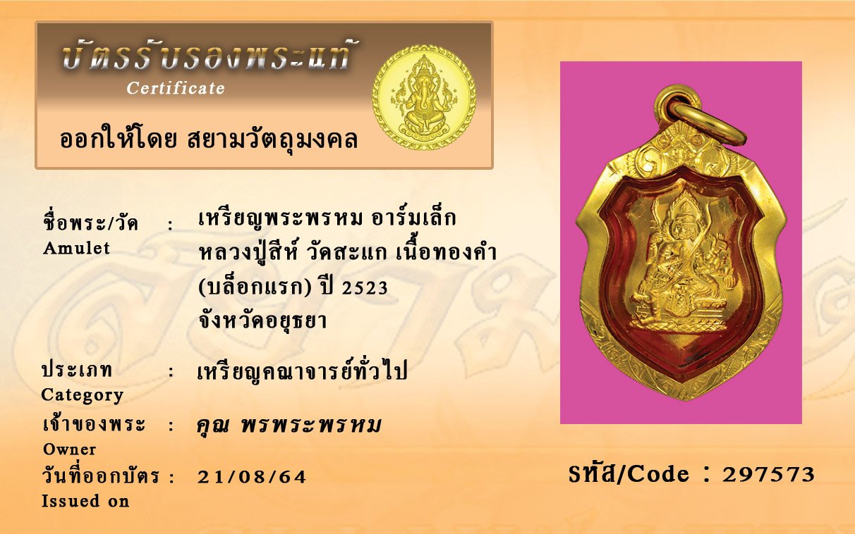 รหัสสินค้า : 297573 เหรียญพระพรหม อาร์มเล็ก หลวงปู่สีห์ วัดสะแก เนื้อทองคำ (บล็อกแรก) ปี 2523 จังหวัดอยุธยา