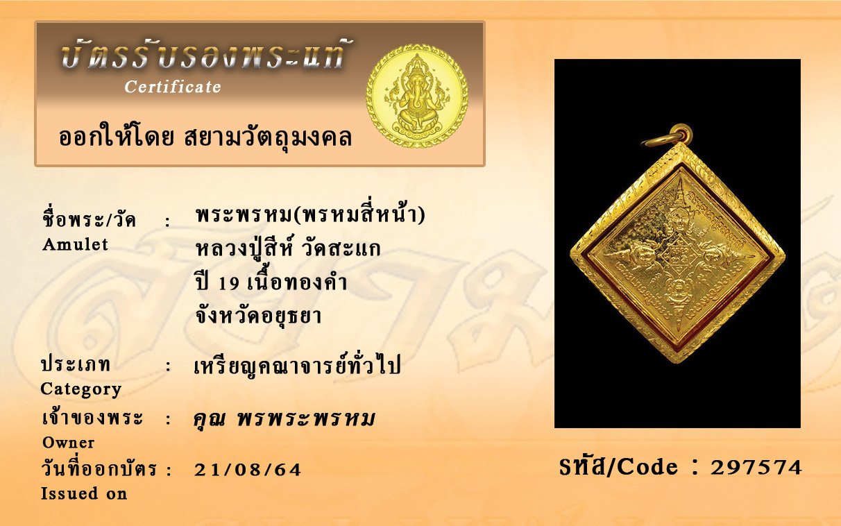 รหัสสินค้า : 297574 พระพรหม(พรหมสี่หน้า) หลวงปู่สีห์ วัดสะแก ปี 19 เนื้อทองคำ จังหวัดอยุธยา