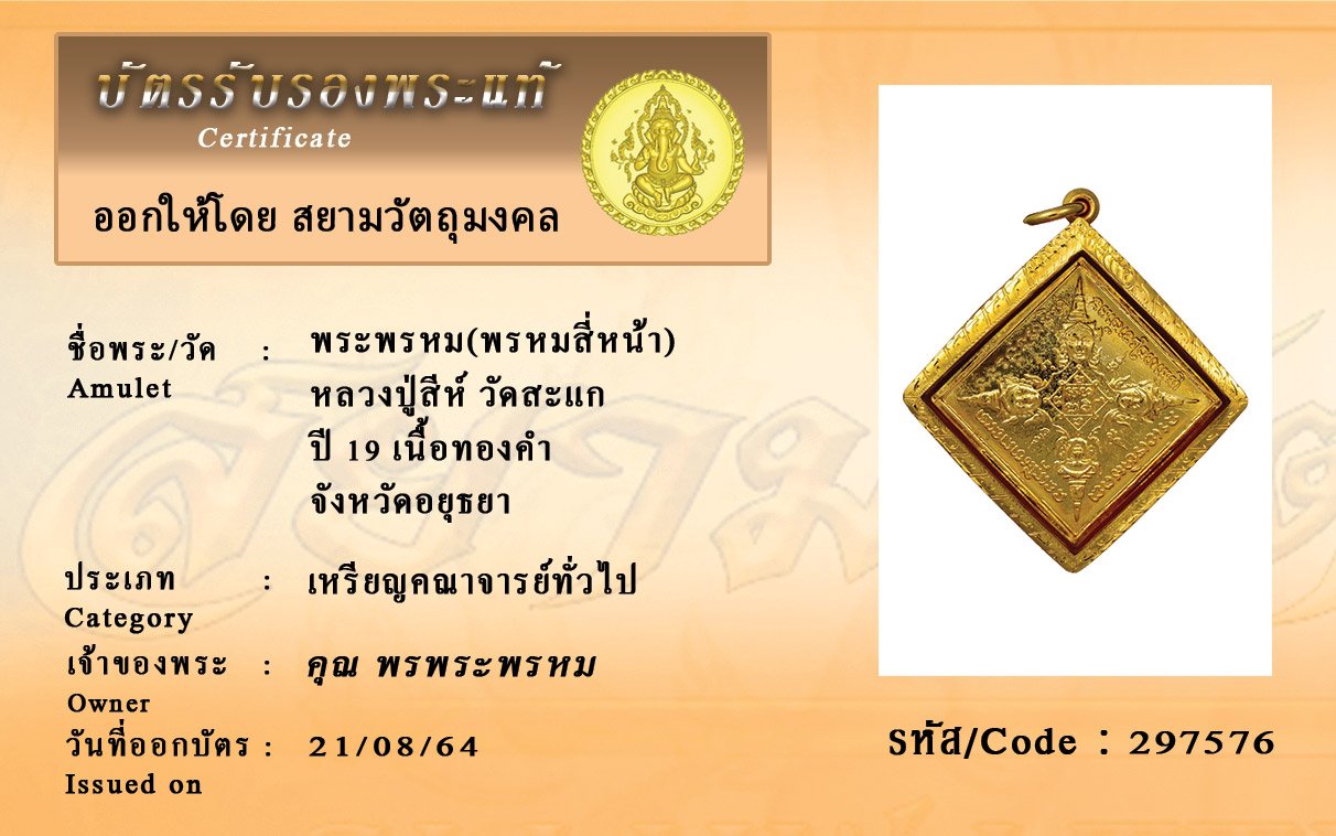 รหัสสินค้า : 297576 พระพรหม(พรหมสี่หน้า) หลวงปู่สีห์ วัดสะแก ปี 19 เนื้อทองคำ จังหวัดอยุธยา