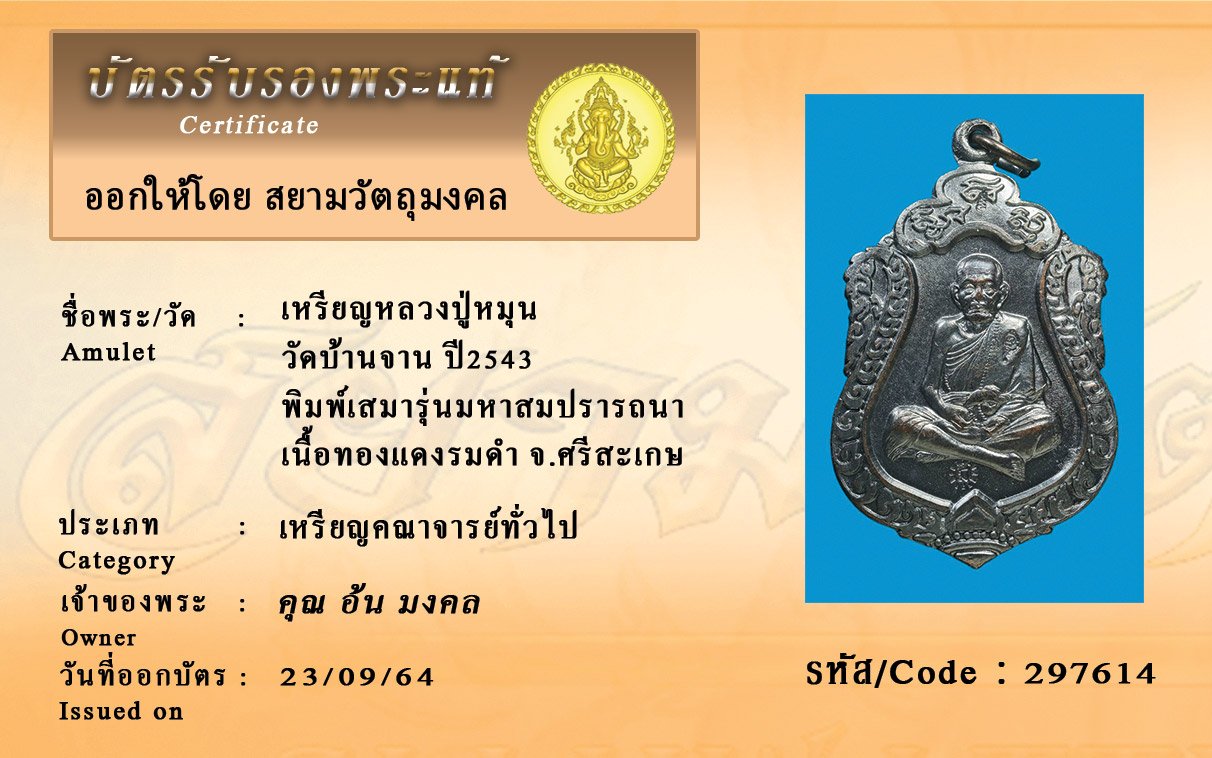 รหัสสินค้า : 297614 เหรียญหลวงปู่หมุน วัดบ้านจาน ปี2543 พิมพ์เสมารุ่นมหาสมปรารถนา เนื้อทองแดงรมดำ จ.ศรีสะเกษ