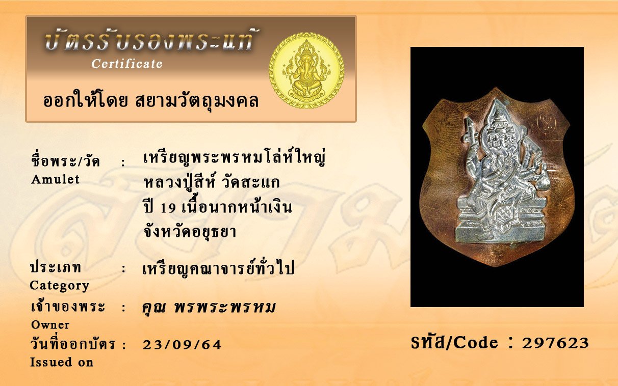 รหัสสินค้า : 297623 เหรียญพระพรหมโล่ห์ใหญ่ หลวงปู่สีห์ วัดสะแก ปี 19 เนื้อนากหน้าเงิน จังหวัดอยุธยา