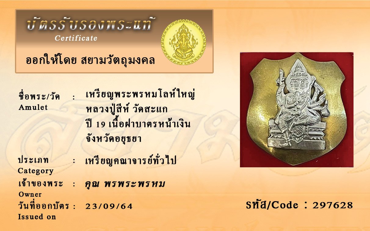 รหัสสินค้า : 297628 เหรียญพระพรหมโลห์ใหญ่ หลวงปู่สีห์ วัดสะแก ปี 19 เนื้อฝาบาตรหน้าเงิน จังหวัดอยุธยา