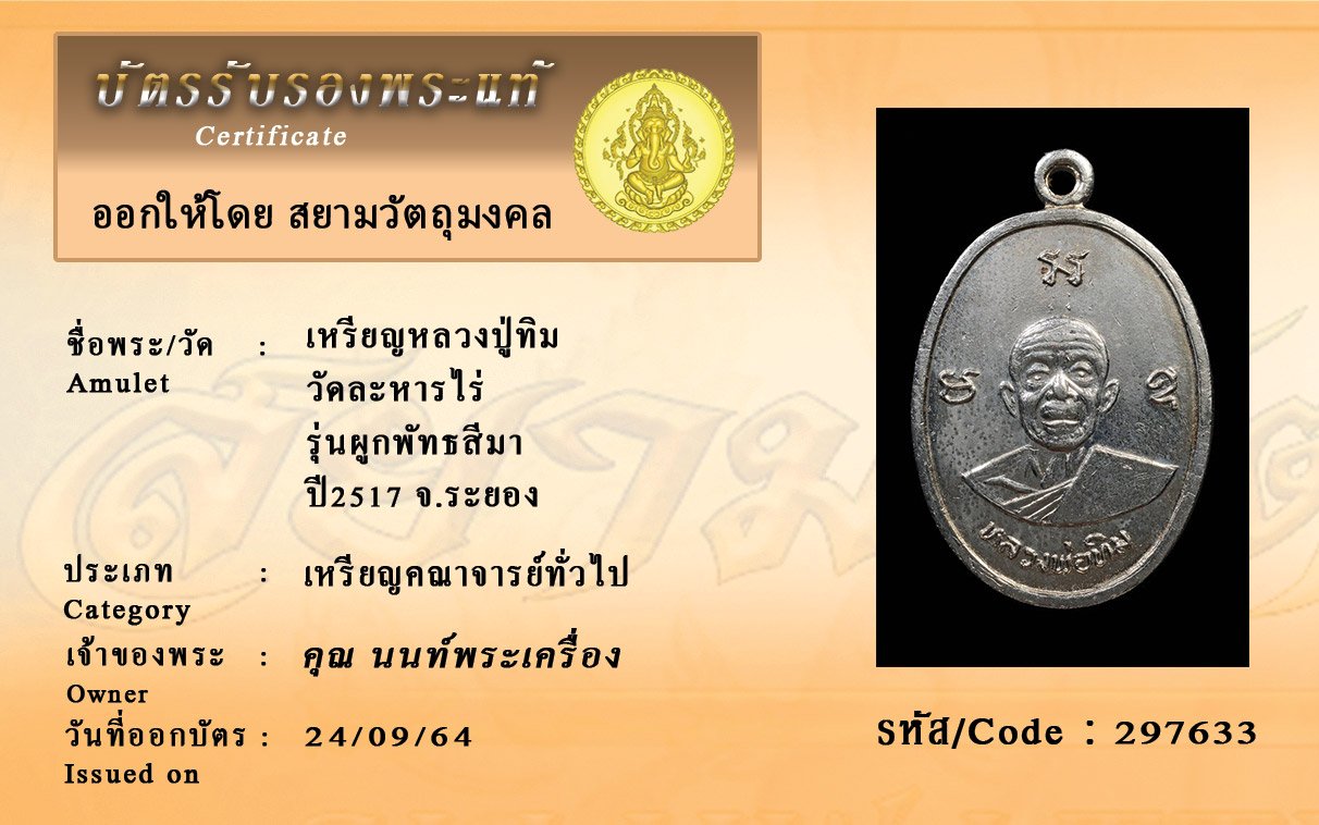 รหัสสินค้า : 297633 เหรียญหลวงปู่ทิม วัดละหารไร่ รุ่นผูกพัทธสีมา ปี2517 จ.ระยอง