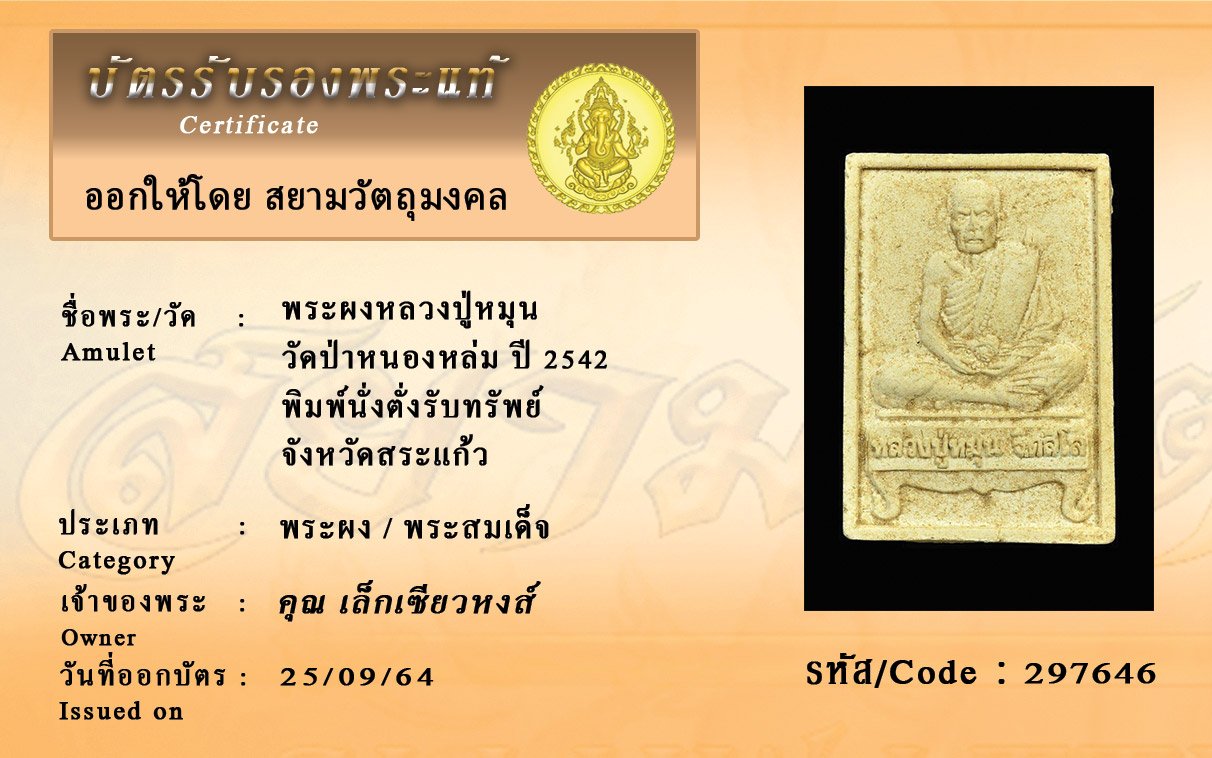 รหัสสินค้า : 297646 พระผงหลวงปู่หมุน วัดป่าหนองหล่ม ปี 2542 พิมพ์นั่งตั่งรับทรัพย์ จังหวัดสระแก้ว