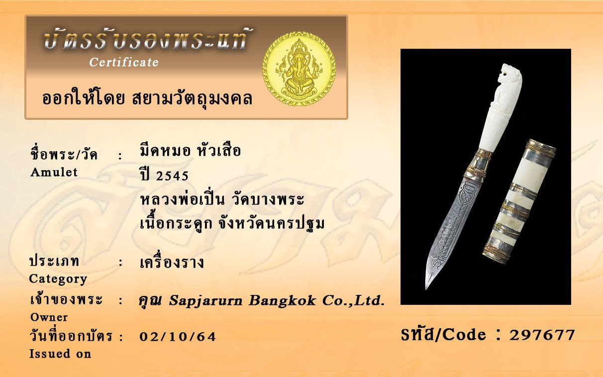 รหัสสินค้า : 297677 มีดหมอ หัวเสือ ปี 2545 หลวงพ่อเปิ่น วัดบางพระ เนื้อกระดูก จังหวัดนครปฐม