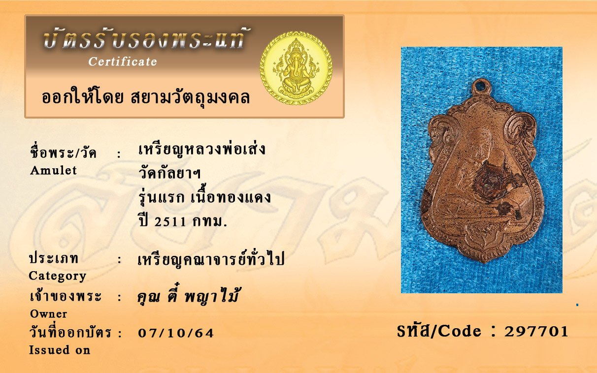 รหัสสินค้า : 297701 เหรียญหลวงพ่อเส่ง วัดกัลยาฯ รุ่นแรก เนื้อทองแดง ปี 2511 กทม.